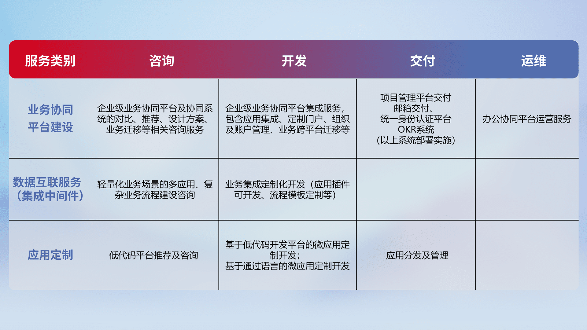 针对钉钉、、、企微、、、、IDaas等平台级产品提供产品的规划、、、、方案、、交付、、、定制化开发等服务,,,,实现如统一协同办公、、、、智能客户服务、、、混合会议管理、、、智能数据查询、、等业务场景,,,实现数字化转型。。。。