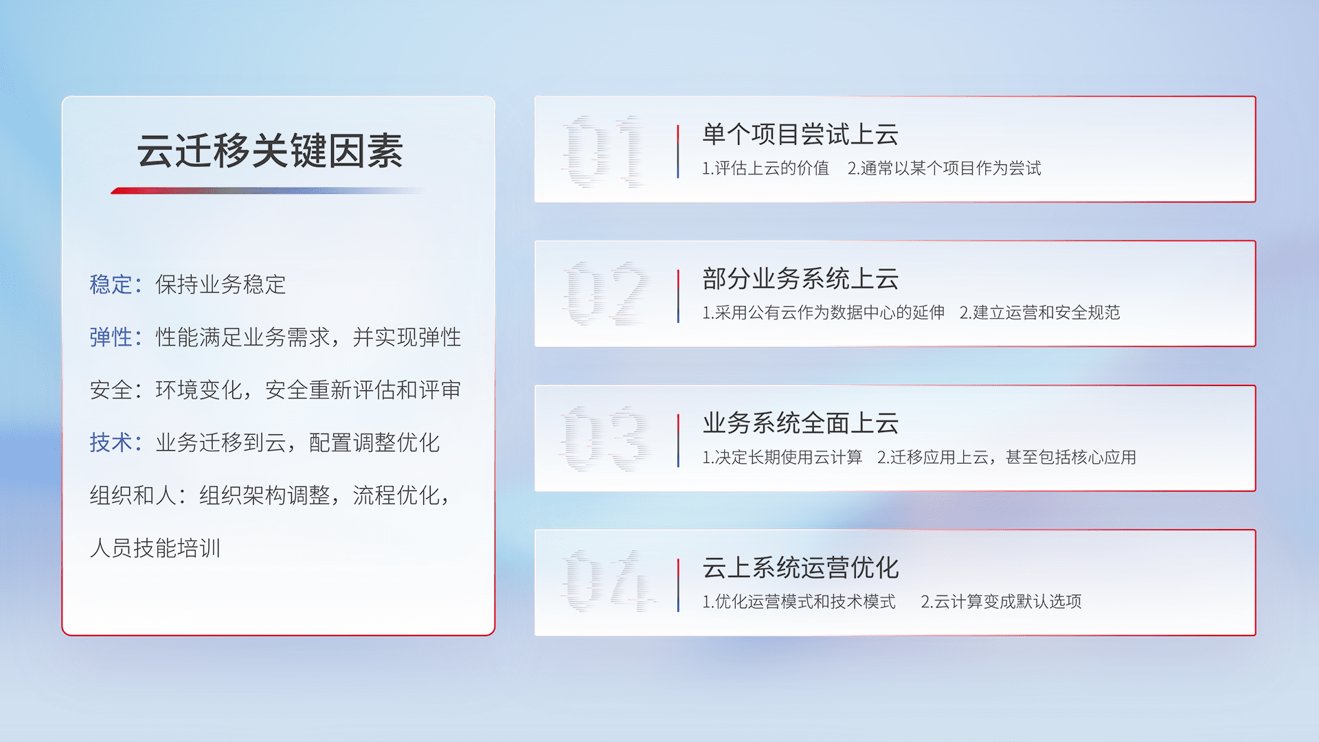 结合实际业务,,从规划设计、、、、云平台选型、、、云原生改造、、数据迁移、、集成交付,,迁移全过程为客户识别最佳上云路径,,,做好风险识别管理,,,,设计网络架构、、、身份权限、、、安全审计合规、、、、操作审计、、、日志审计、、、、监控告警策略、、多站点容灾设计等,,,,对云上基础设施进行整体规划,,,,提升IT治理水平,,,以满足弹性、、、高可用、、、高性能的需求。。